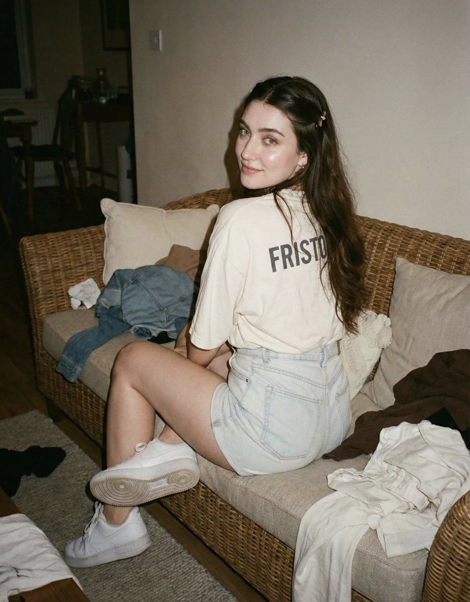{"image_generation":{"identity":{"preserve_original":true,"reference_match":true,"description":"Facial features must remain exactly identical to the provided reference photo."},"photo_style":{"type":"hyperrealistic lifestyle photo","camera_vibe":"Olympus MJU II aesthetic","lighting":"warm dim indoor lighting OR 35mm film-style flash","tone":"warm vintage VSCO vibe","texture":"soft grain, subtle film rendering","framing":"wide shot showing interior room details"},"subject":{"pose":{"body":"sitting on a woven sofa with back turned to the viewer","legs":"folded comfortably","hands":"one hand resting on the sofa","head":"looking over shoulder at the camera","expression":"playful, soft, naturally charming"},"appearance":{"hair":{"length":"long","style":"loose with a side part","accessory":"simple small hair clip"},"makeup":{"style":"light Korean glass-skin makeup","details":{"skin":"glowy, dewy finish","lips":"soft pink","eyes":"minimal eyeshadow, natural lashes"}}},"clothing":{"top":{"type":"cream oversized vintage T-shirt","print":"bold graphic text 'FRISTO' on the back"},"bottom":{"type":"light high-waisted denim shorts"},"shoes":{"type":"white sneakers"}}},"environment":{"setting":"cozy messy room","elements":["woven sofa","white pillows","scattered clothes in the foreground","soft indoor clutter for authentic lifestyle atmosphere"],"lighting_effects":["warm dim glow","or direct compact film camera flash","soft warm shadows enhancing vintage mood"]},"aesthetic":{"style":"vintage lifestyle editorial","vibe":"warm, nostalgic, candid","features":["rich room detail","natural textures of fabric and skin","soft grain and warm tones"]}}}