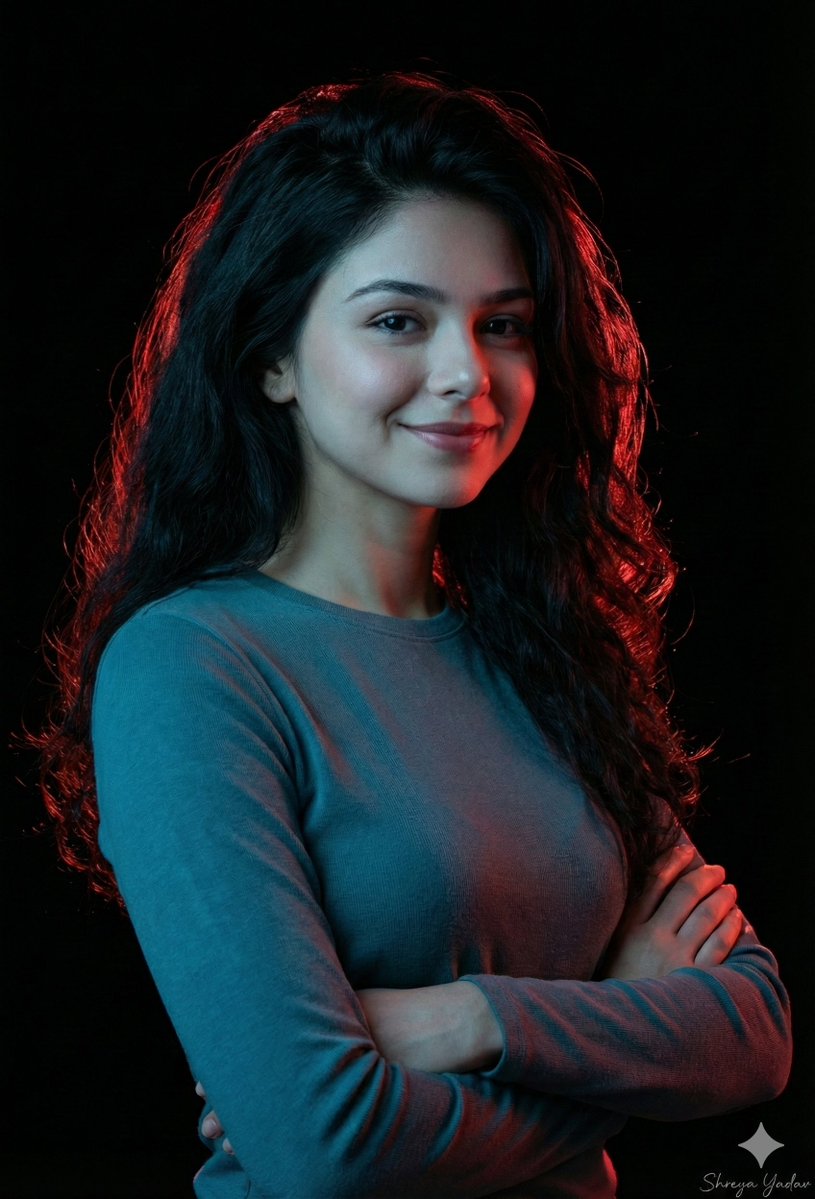 {"prompt":"A hyper ultra-realistic portrait of a young woman with short messy black hair and a soft short-haired look matching the reference, smiling confidently with her arms crossed, wearing a teal long-sleeve crew-neck shirt. Dramatic red rim lighting from the right and cool blue fill light from the left, against a pure black studio background. Three-quarter view, looking slightly up, cinematic portrait photography. Use the provided reference image for the face — do not change the face.","reference_face":"use_reference_image","style":"cinematic, ultra-realistic, dramatic lighting","lighting":{"rim_light":"red from the right","fill_light":"cool blue from the left"},"camera":{"view":"three-quarter","angle":"slightly upward"},"signature":"Shreya Yadav"}